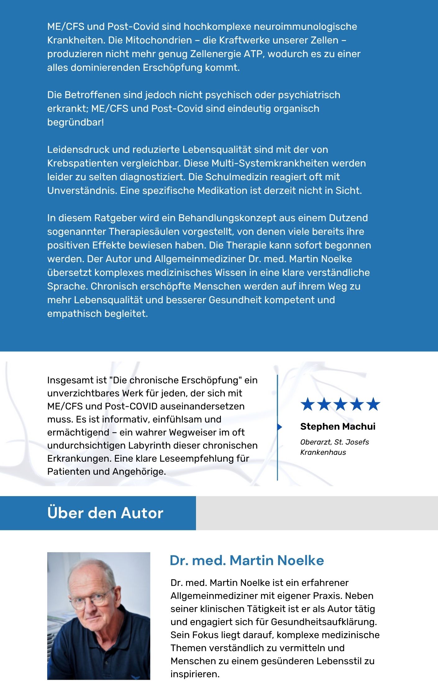 Dr. med. Martin Noelke ist seit 1984 als Facharzt für Allgemeinmedizin in Homberg (Ohm) niedergelassen. Seine langjährige Tätigkeit als Landarzt, geprägt von einem tiefen Verständnis für die Nöte seiner Patienten, und sein unermüdliches Interesse an Ernährungsmedizin und Naturheilverfahren bilden das Fundament dieses Buches. Seit 2011 beschäftigt er sich intensiv mit ME/CFS und seit der Pandemie mit Post-COVID.
